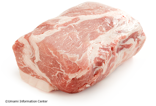 The pig is a domesticated boar that ranged in the area from Europe to Asia. China has the longest history of pork eating. There are many famous Chinese dishes of pork including sweet and sour pork, hui guo rou (twice cooked pork), simmered diced pork and jinhua huotui (cured ham). Pork fillet is particularly high in glutamate. Broth made from pork bones is a quintessential umami-rich soup. Moreover, cured ham, which is made from pork, is one of the main umami-rich ingredients. Pork is rich in inosinate. Combined with local vegetables and seasonings, dishes using umami synergy are popular in many countries.