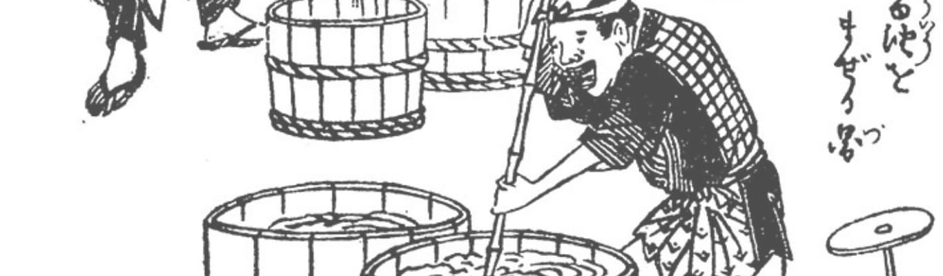 A depiction of soy sauce production during the Edo Period from the Koeki Kokusanko Kan-no-go: Shoyu-Zukuri ("Record of Nationwide Production Prosperity Volume Five: Soy Sauce Production"). From the National Diet Library Modern Digital Library Collection.