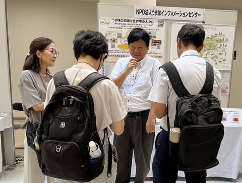 This year’s Annual Meeting, held at Tokai Gakuen University Nagoya Campus, was themed “Rediscovering Culinary Techniques and Tools” and attracted many researchers and members of the academic community. At UIC’s booth, a wide range of visitors stopped by, including professors who provide guidance on dashi, umami, taste, and nutrition, as well as students, Japanese cuisine chefs, and corporate researchers.