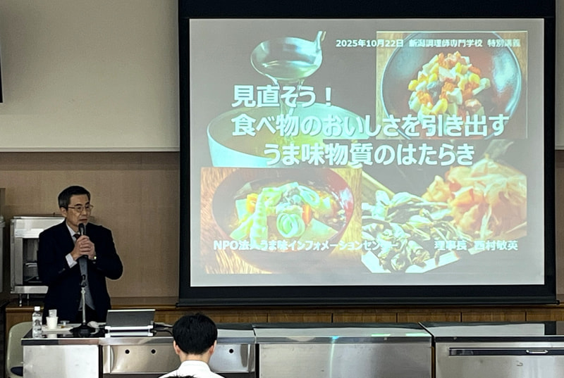On October 22, a lecture on umami was held at Niigata Cooking Technical School. This special lecture has been offered annually since 2014, and this year, for the first time, Dr. Toshihide Nishimura delivered the lecture under the theme “Let’s Reconsider! The Role of Umami Substances in Enhancing Deliciousness.” Niigata Cooking Technical School is a long-established institution that produces many professionals in the culinary field each year. Approximately 45 students currently enrolled at the school participated in this year’s session.