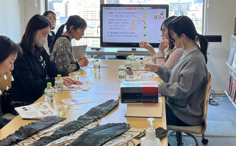 Next, participants explored umami synergy using kombu dashi (broth) and katsuobushi dashi (broth). They first tasted kombu dashi, then added katsuobushi to create awase dashi (a combined dashi).