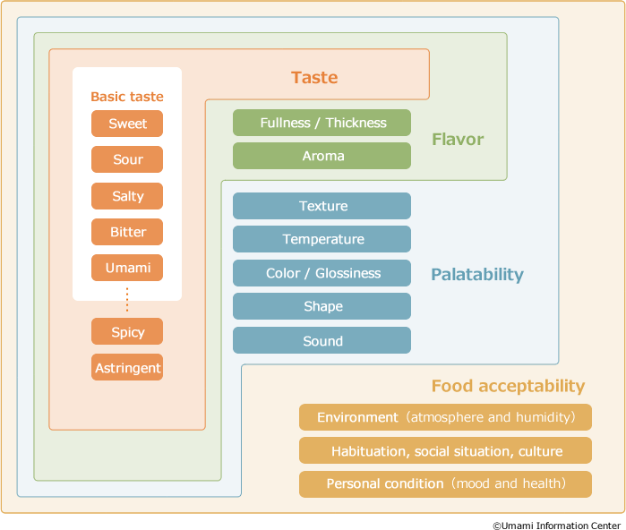 Since the word “umami” is originally Japanese and the Japanese expressions “to have umami” and “umai” can mean “tastiness” or “deliciousness,” “umami” is often confused with “deliciousness.” Whether something tastes good or not is a comprehensive yet subjective evaluation determined by elements such as taste, aroma, texture and temperature, besides other factors such as appearance, color and shape, as well as one’s physical condition, surrounding environment, cultural background, and previous experiences. Of these various elements, umami in balance with the other basic tastes (sweet, sour, salty, and bitter) plays an important role in determining the deliciousness of a dish.